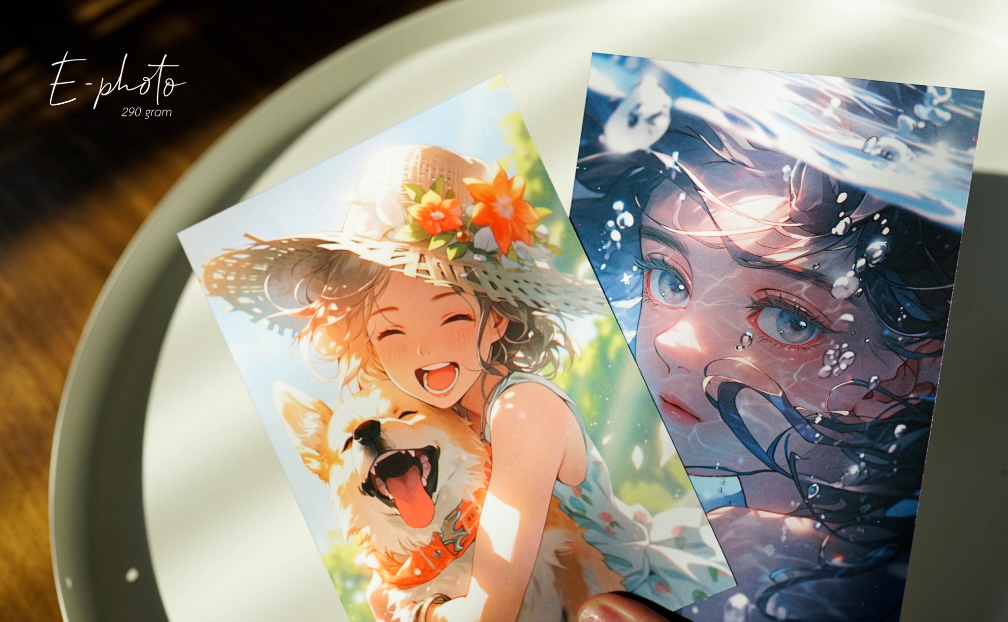 งานกระดาษ E-Photo จะเป็นงานไม่เคลือบผิวเนื้อกระดาษนะคะ เพราะถ้าเคลือบแล้วจะทำให้เกิดฟองได้ แต่จริงๆแล้วไม่จำเป็นต้องเคลือบก็ได้เนื่องจากตัวกระดาษ E-Photo จะมี Texture เนื้อกระดาษเฉพาะอยู่แล้ว ถ้าเคลือบก็จะอาจจะเห็น Texture ไม่ชัดเจนน้า ตัวกระดาษของทางร้านจะเป็นขนาด A3 แต่สามารถให้ทางพี่เป็ดตัดแบ่งตามขนาดหรือจะไดคัทตามทรงที่ต้องการก็ได้ทั้งนั้น เพียงแค่แจ้งมานะค้า
